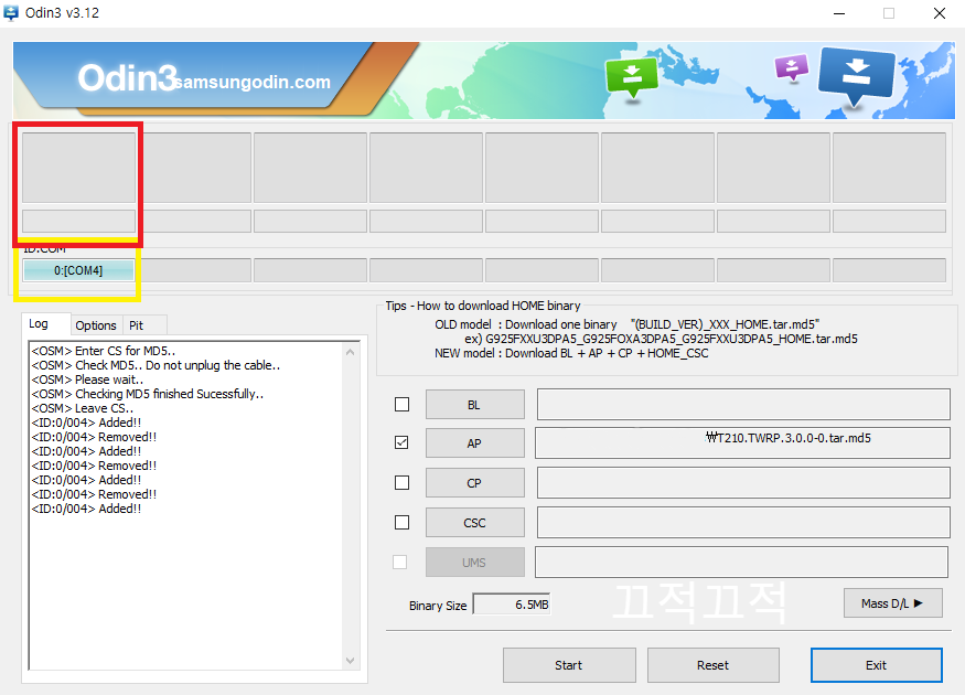 3. 우측 AP버튼 클릭 → T210.TWRP.3.0.0-0.tar.md5 파일 불러오기