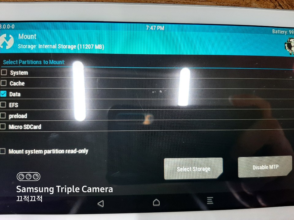 볼륨 상 + 홈버튼 + 전원버튼을 눌러 TWRP에 진입합니다.